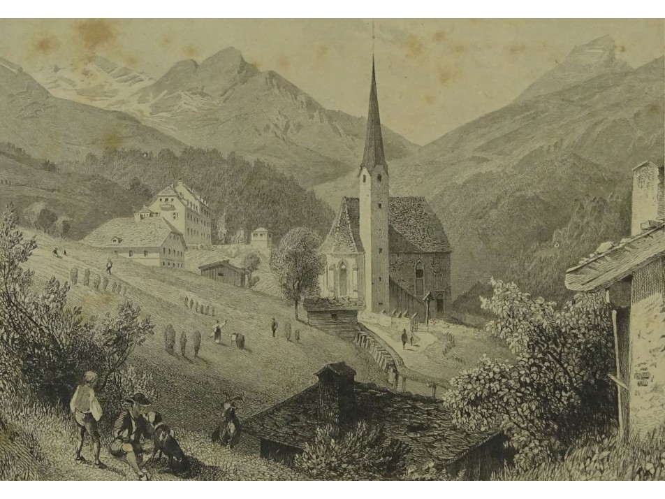 Antik osztrák acélmetszet ST. NICOLAUS alpok