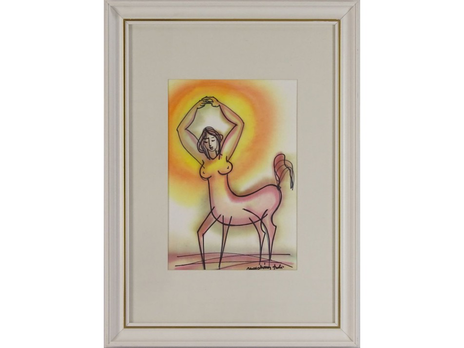 Keretezett, jelzett, színezett, selyem festmény üveglap mögött, paszpartuban.