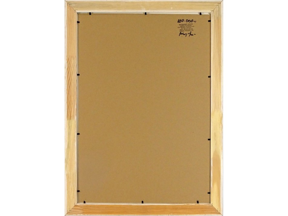 A kép hátulján lévő kartonon a művésznő bélyegzője látható, felette a kép ára 100.000 Ft és a művésznő aláírása.
