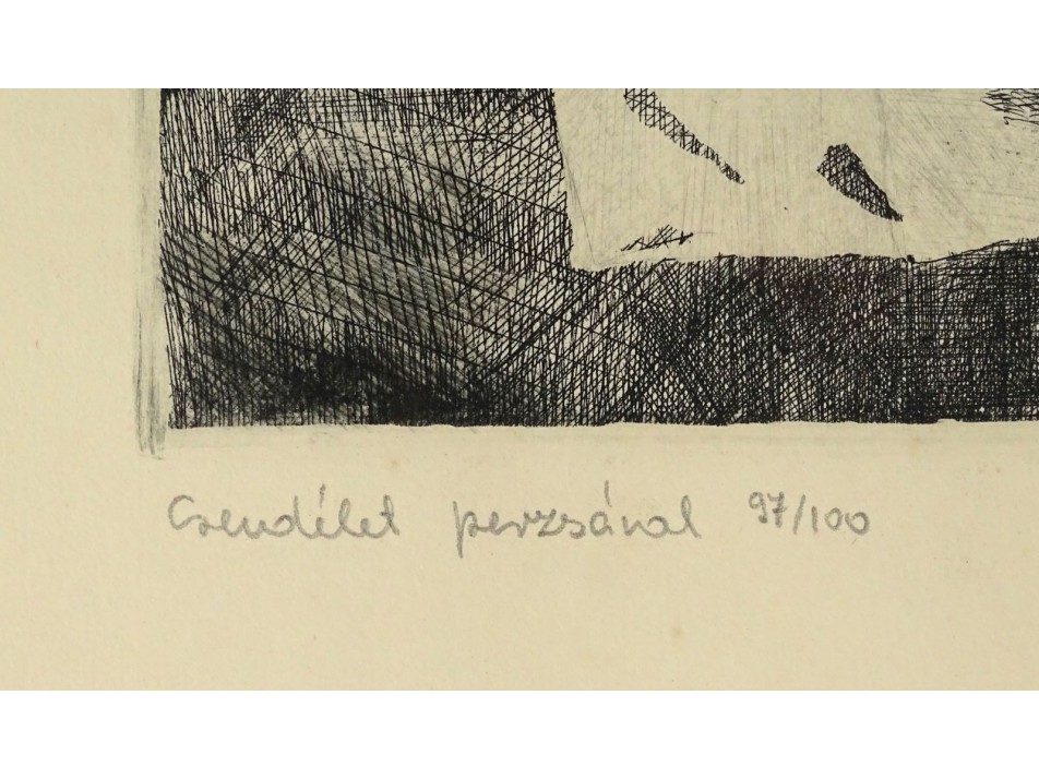Sorszámozott papír rézkarc üveglap mögött, fenyő keretben.