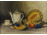 Asztali csendélet gyümölcsökkel, teáskészlettel.