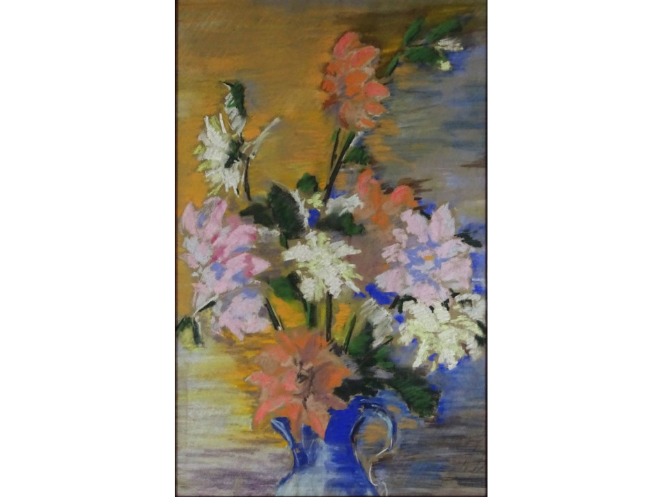 Papír pasztell festmény üveglap mögött, kopottas ezüst színű keretben. Akasztási lehetőséggel rendelkezik.