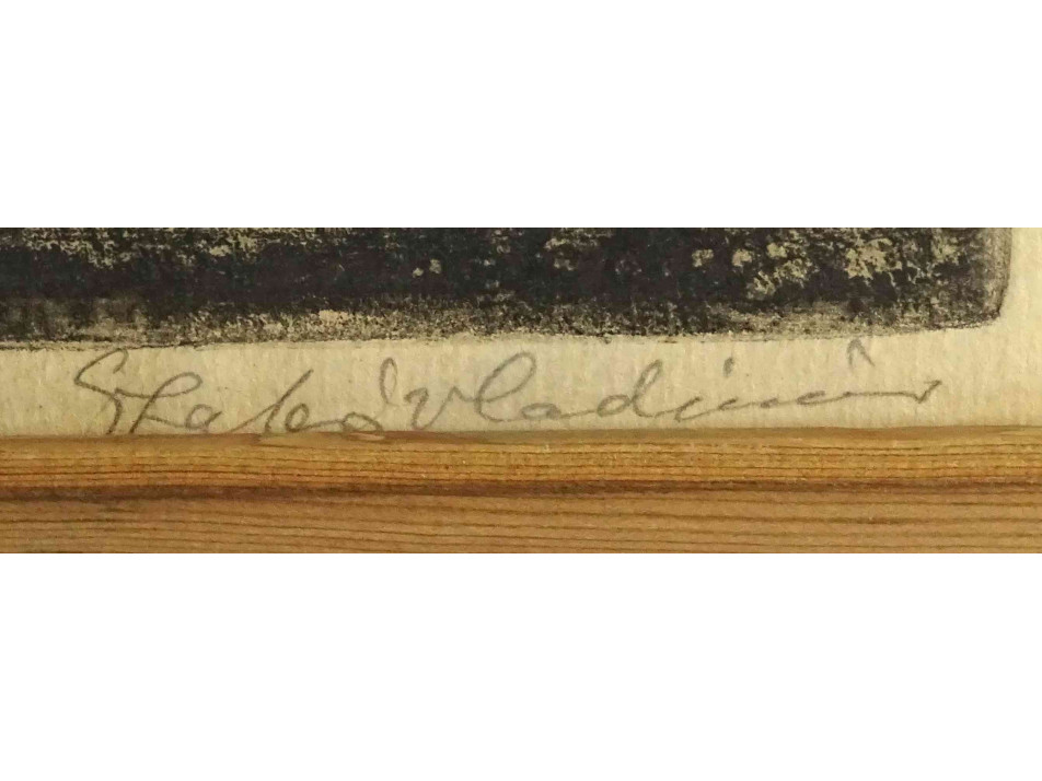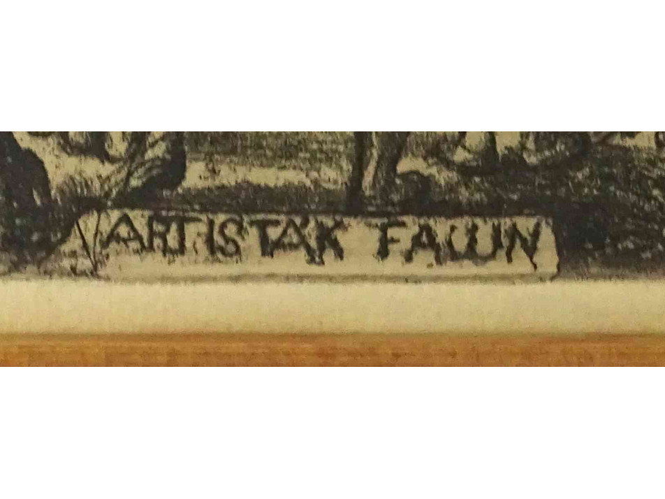 Jelzett papír rézkarc, üveglap mögött, léc keretben.