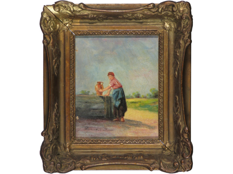 Régi gobelin tájkép mahagóni keretben 48 x 52.5 cm