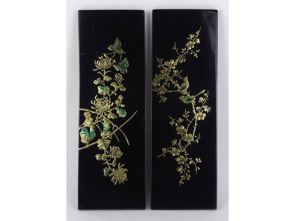 Régi aranyozott keleti lakkfa táblakép pár 30 x 10 cm