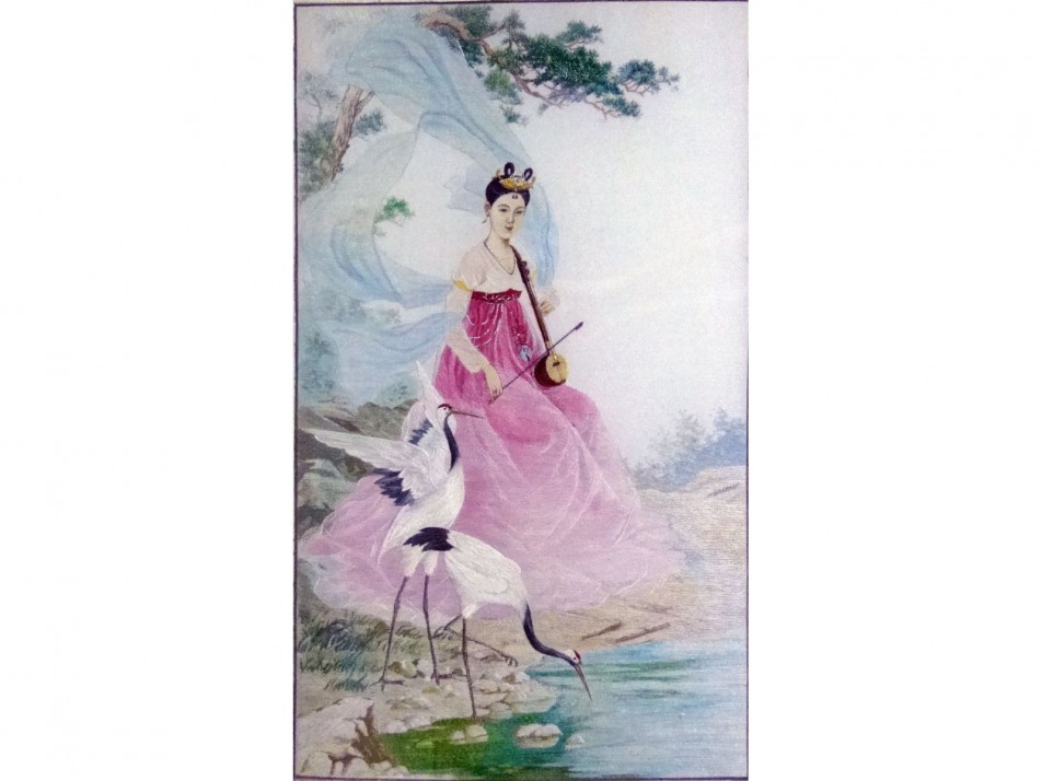 Gyönyörű varrott selyemkép üveg mögött, keretezve.