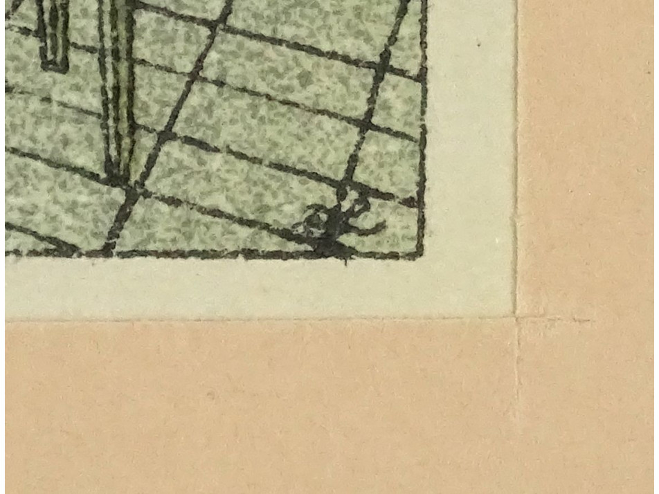 Színes grafikai munka üveglap mögött, régi fekete keretben. Akasztási lehetőséggel rendelkezik.