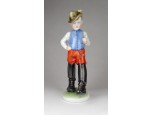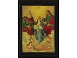 Régi ovális alakú keretben, üveglap mögött található festett végtagokkal és fejjel rendelkező egészalakos fiú portré. Lila ruhája és a virágcsokor a kezében hímzett. Szép állapotú, azonnal falra akasztható állapotban van.