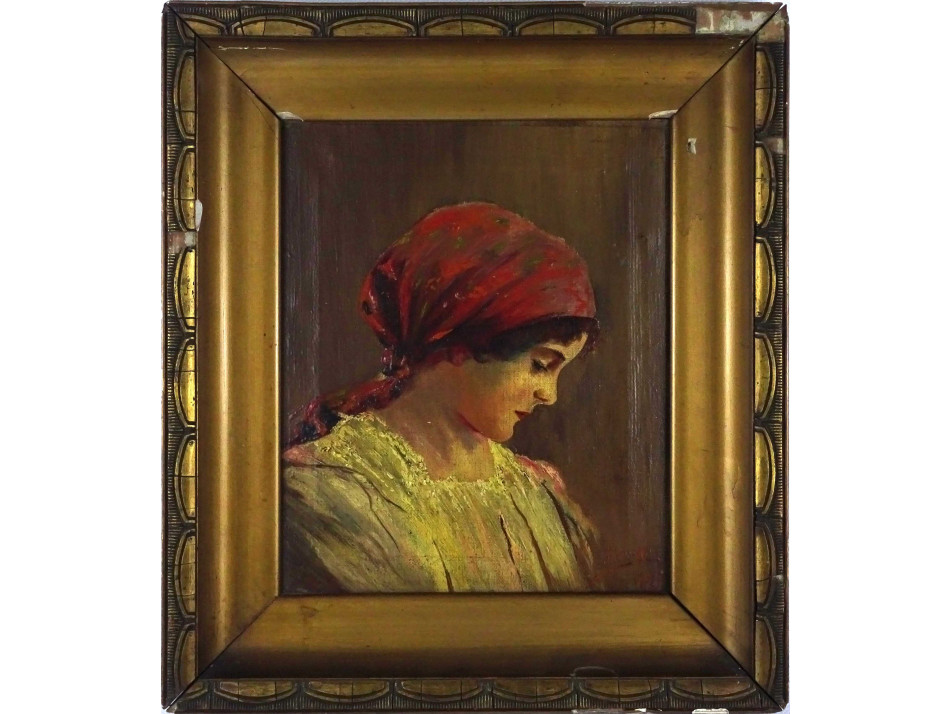 Antik, olaj vászon festmény, női portré, szép állapotú, díszes aranyozott keretben. A kereten több sérülés látható.
