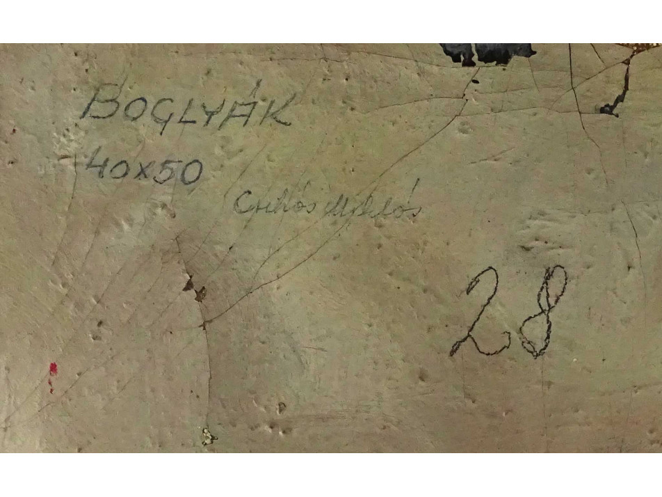 Olaj vászon festmény,üveglap mögött, régi ezüst színű keretben. Akasztási lehetőséggel rendelkezik.