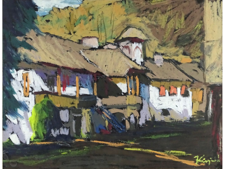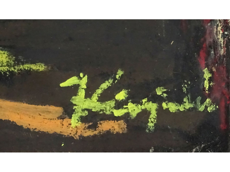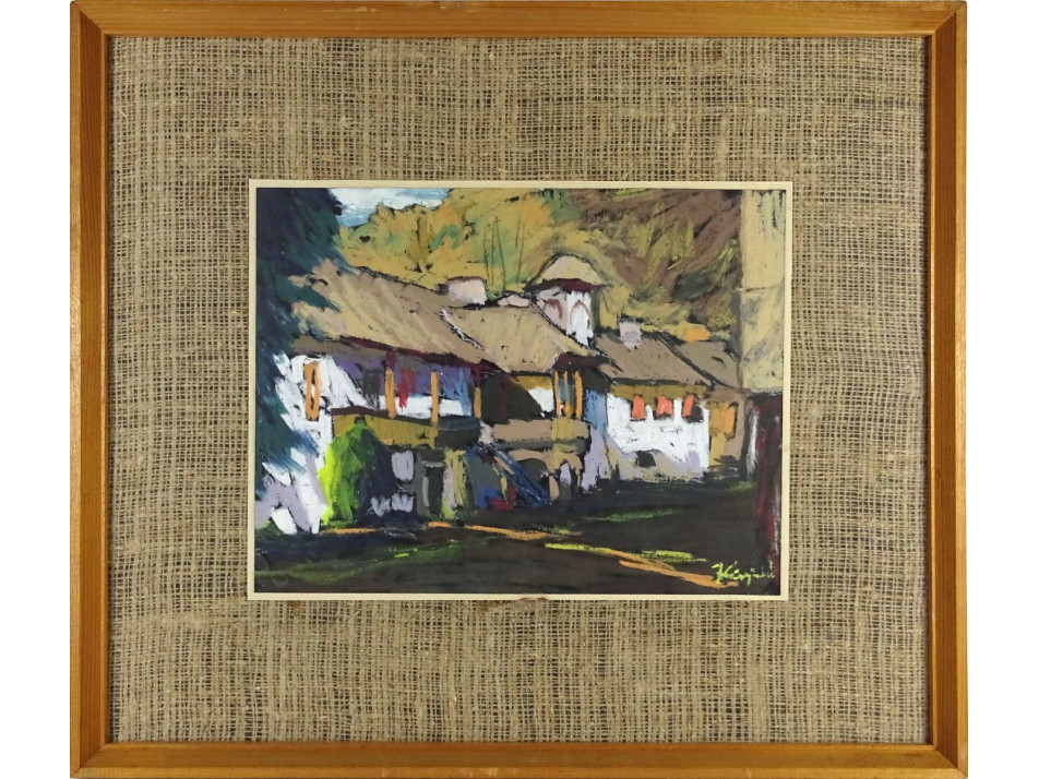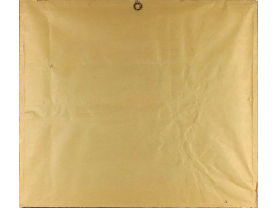 Papír zsírkréta, tempera, akvarell vegyes technika üveglap mögött, zsákvászon háttér előtt, egyszerű fenyőfa keretben. Akasztási lehetőséggel rendelkezik.