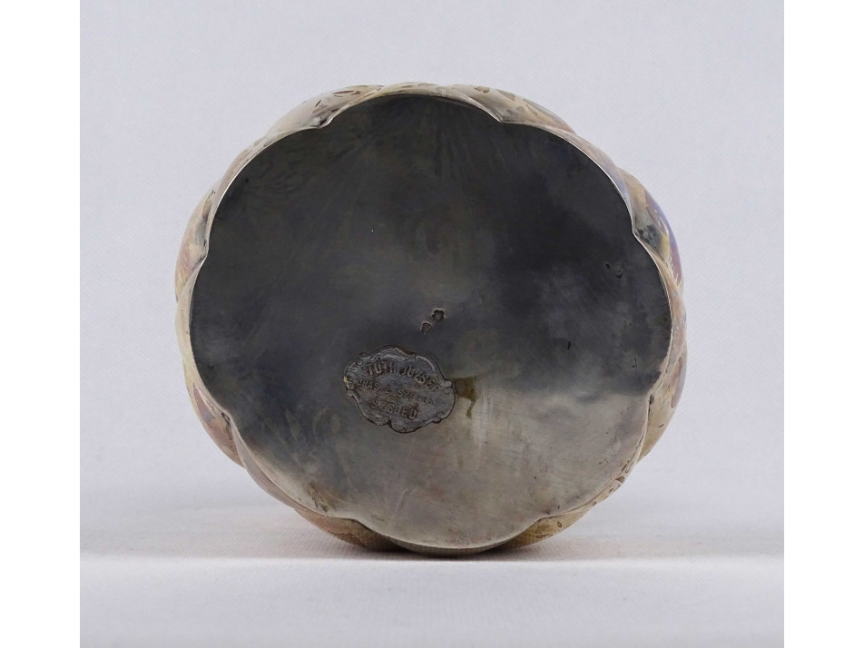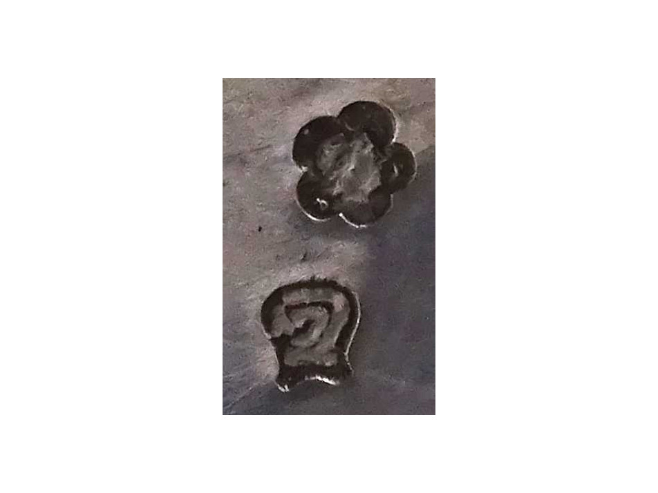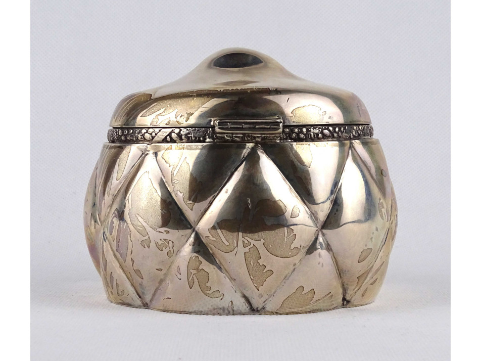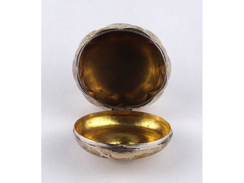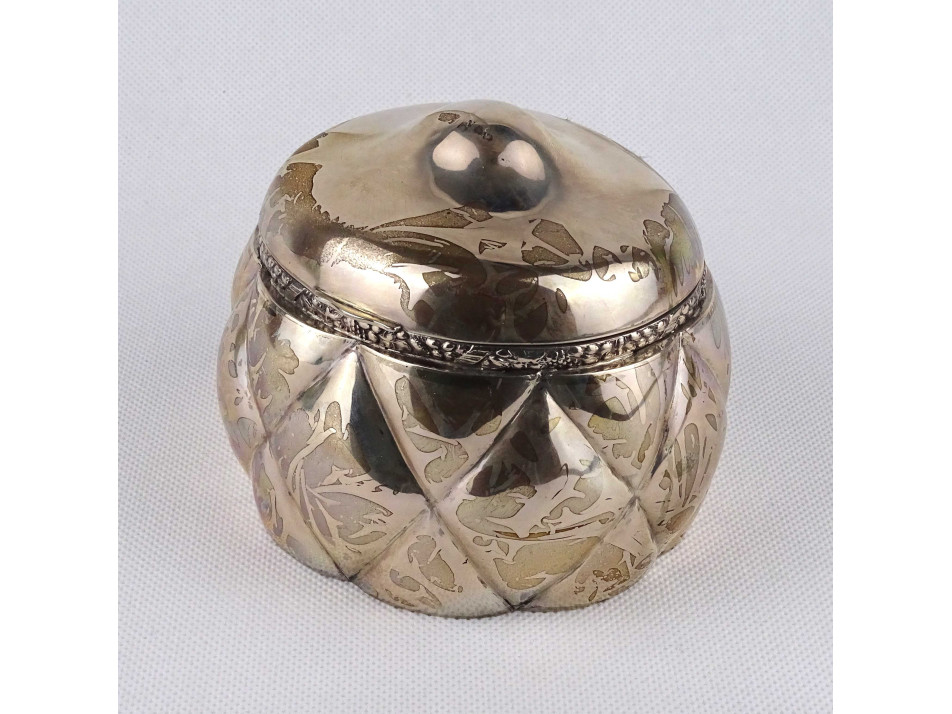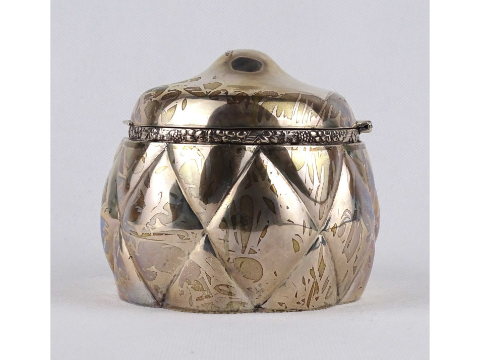 Antik, 800-as finomságú, nagyméretű, hólyagos mintájú cukordoboz, bonbonier. Rajta 1937-ig használt, jobbra néző 3-as Diána fejes, 800-as finomság jelzés, mellette " TGY " mesterjegy látható.