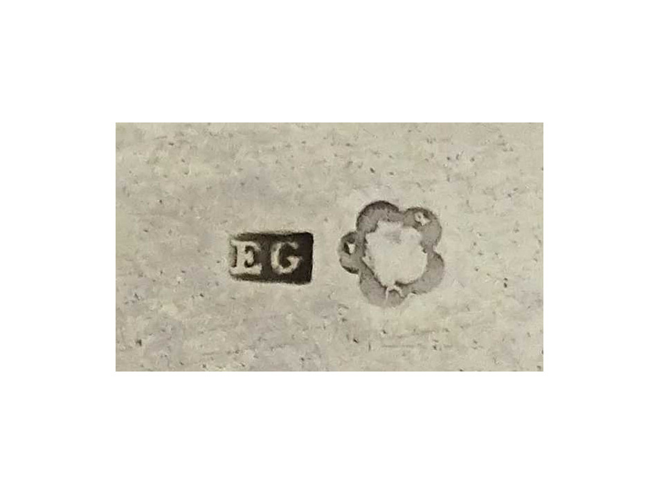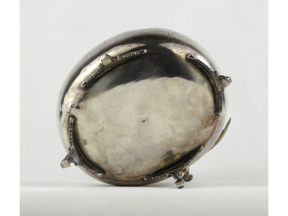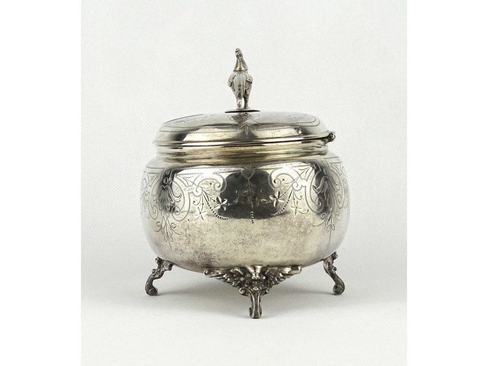 Antik, 800-as finomságú bécsi ezüst, négy lábon álló fedeles bonbonier cukorkínáló fácán alakú fogantyúval és vésett mintákkal díszítve. Aljába alúlról beütött 1937 előtti 3-as Diána fős 800-as bécsi finomságjel, mellette " EG " mesterjel. A fácán alakú fogantyún beütve agárfejes jelzés és a mesterjegy látható.