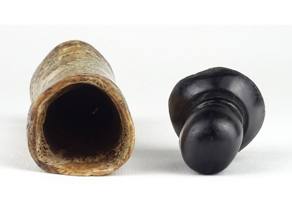 Régi faragott különleges csont, fa rühzsírtartó szelence figurális tároló 20 cm