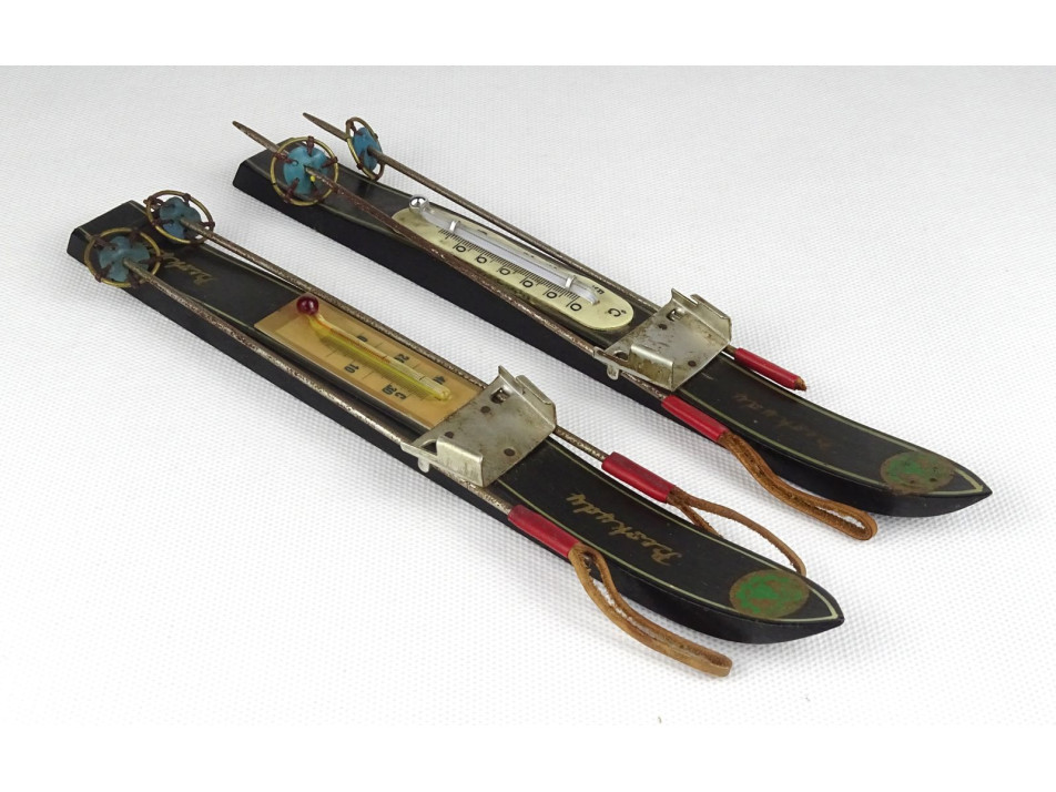 Régi, szép állapotú, kettő darab síléc, levehető síbotokkal, rajtuk egy-egy hőmérővel. Akasztási lehetőséggel rendelkezik.