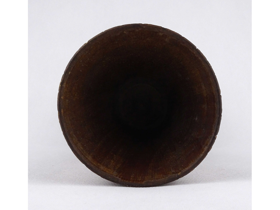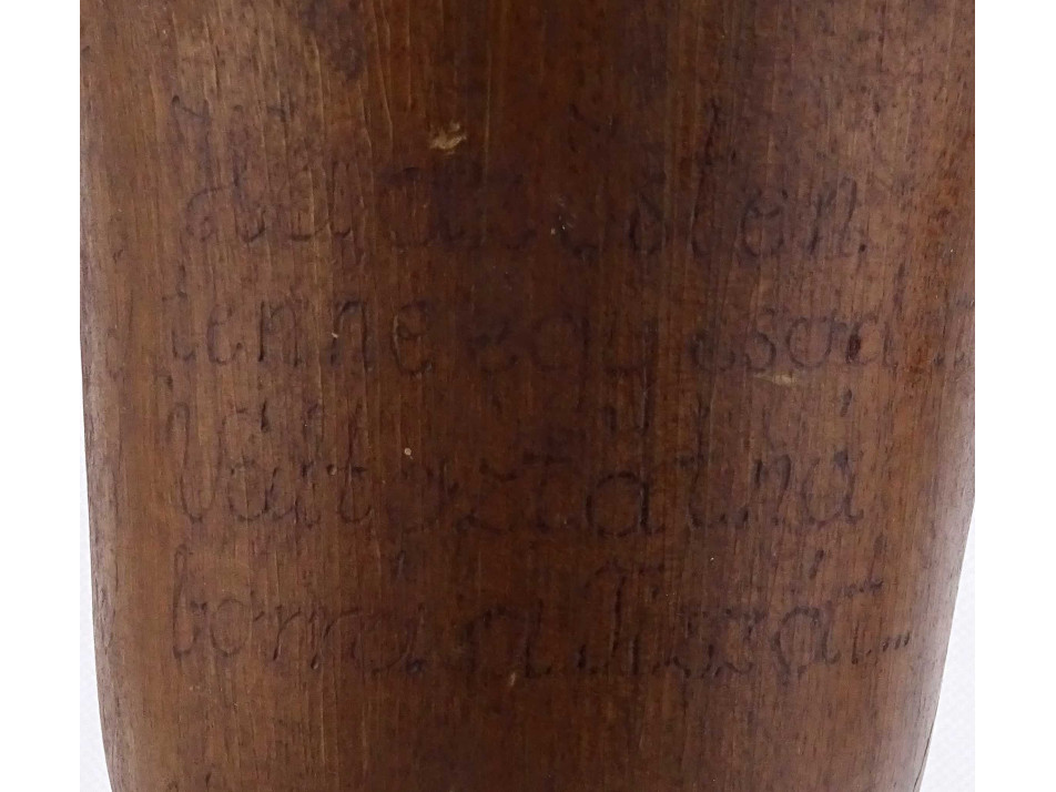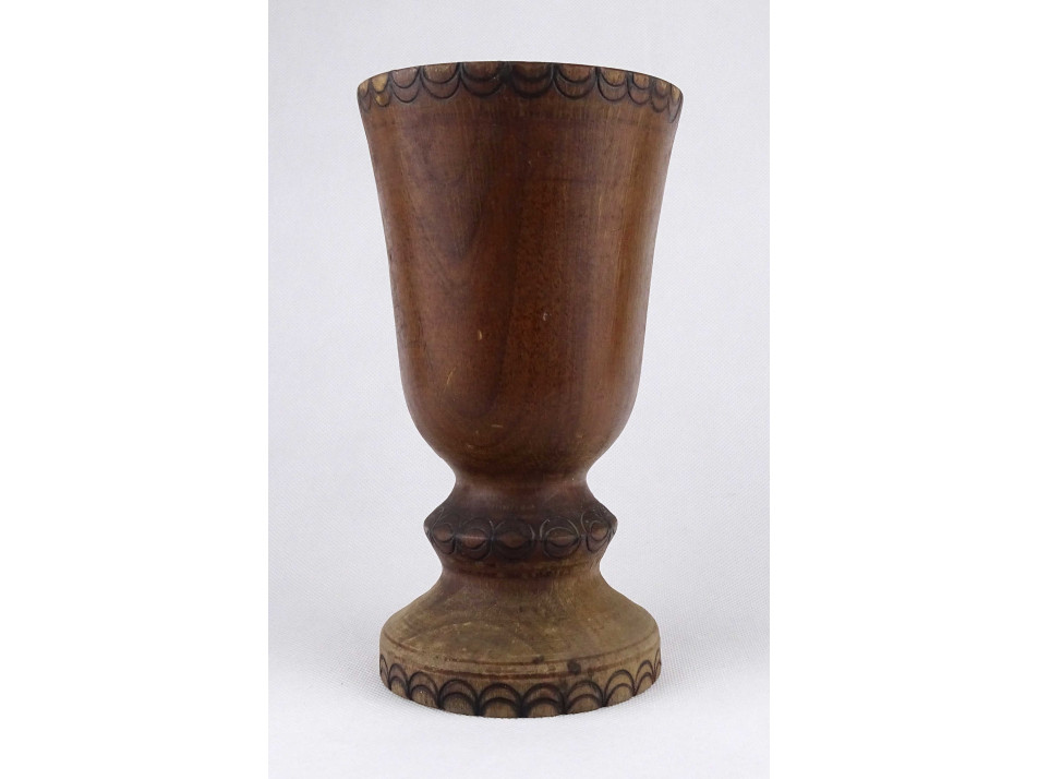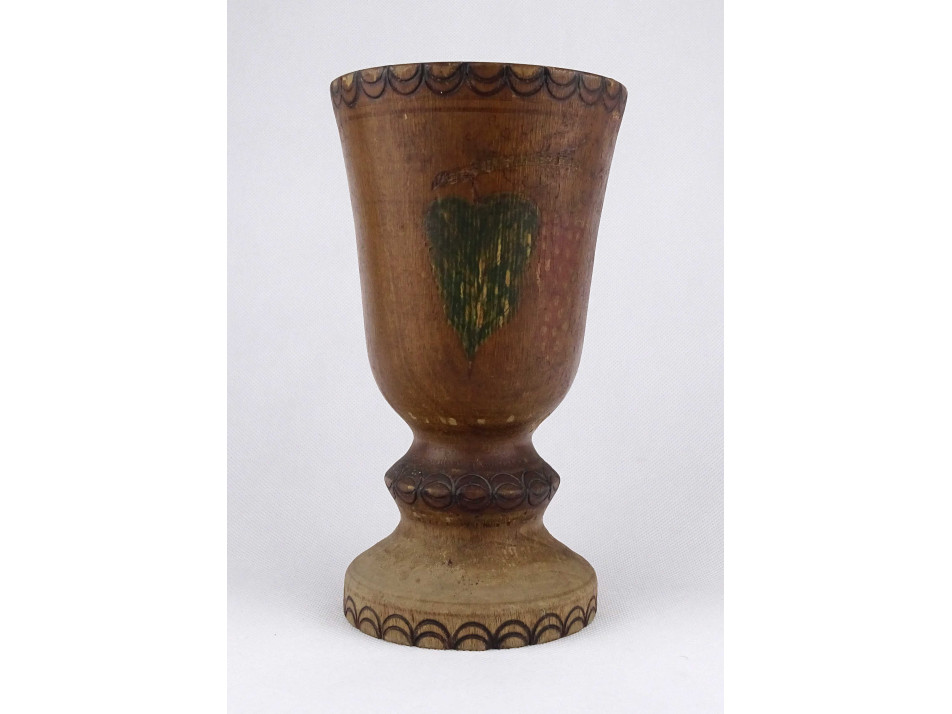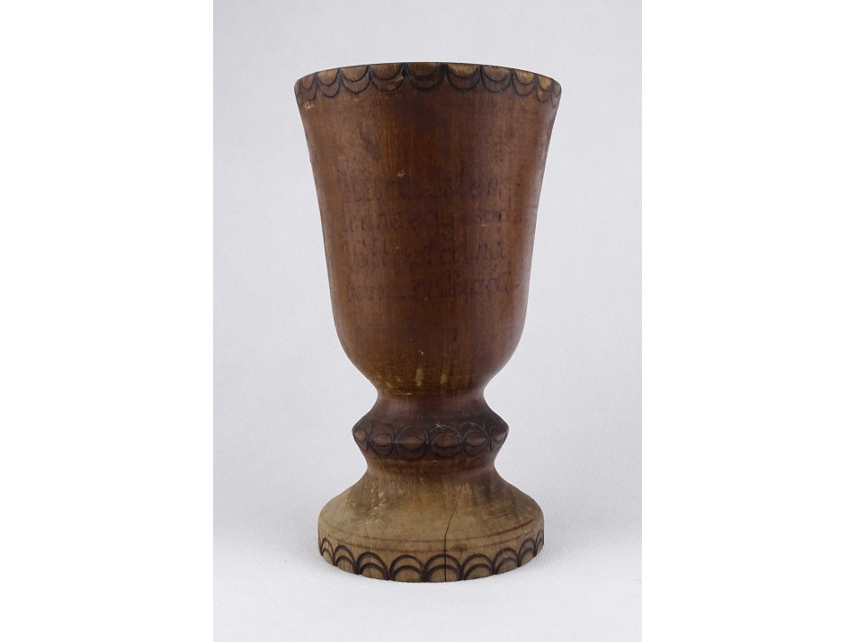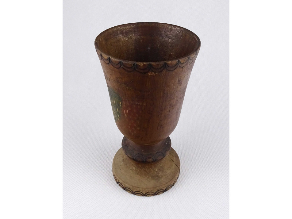 Antik, hibátlan állapotú, lakkozott, égetett mintával díszített feliratos fakupa, talpas fapohár, oldalán szőlőfürt díszítéssel.