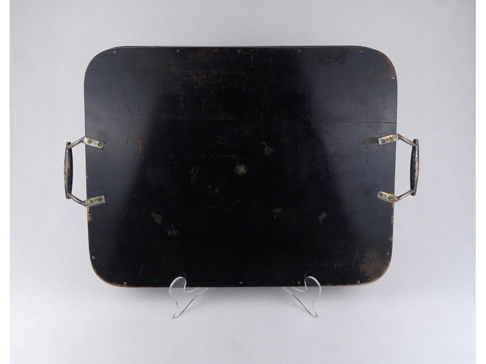 Régi, nagyméretű fekete füles tálca, szervírozó tálca, közepén vésett ezüstözött lemez betéttel. A tálca fülei is ezüstözöttek.