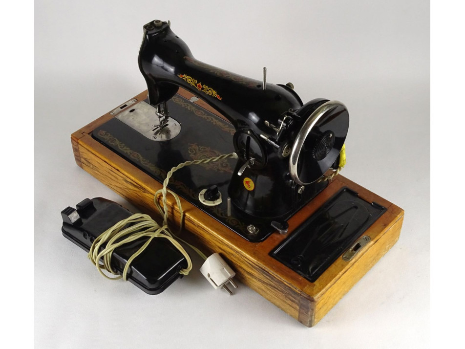 Szép, működőképes állapotban lévő, régi, retro orosz varrógép, szervizdobozával és alkatrészekkel, papírjaival. Zárható, kulccsal, hordfüllel rendelkező fadobozában.