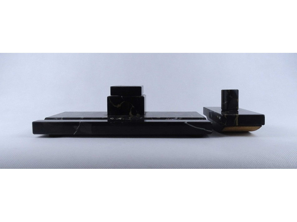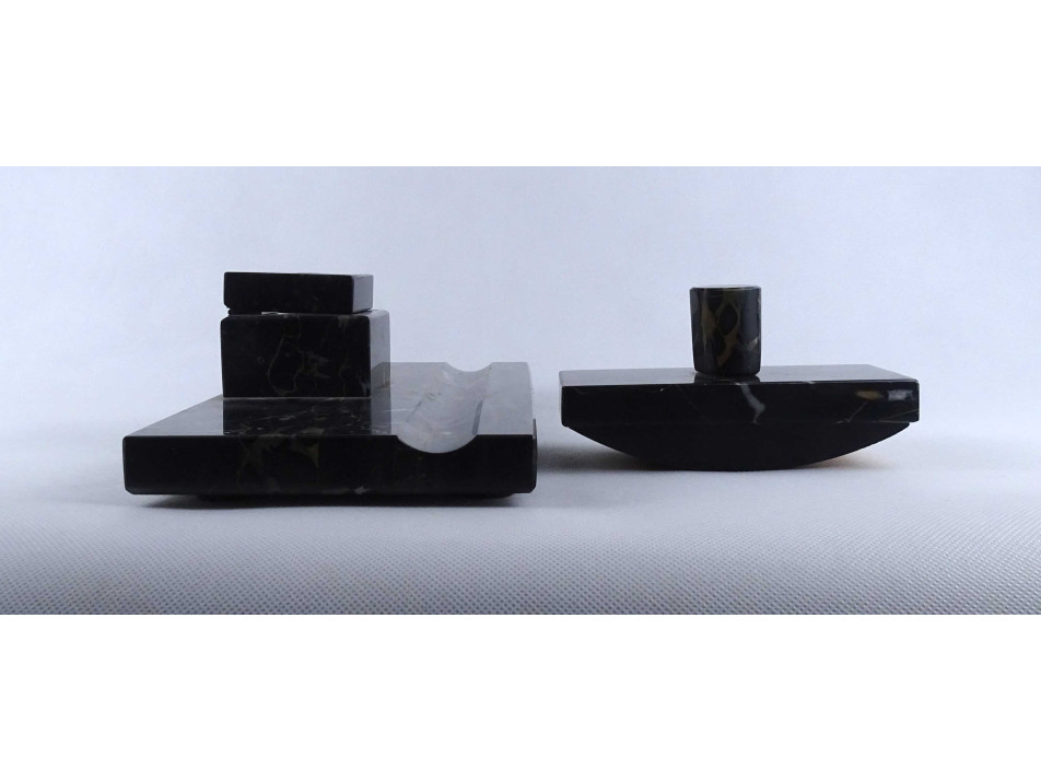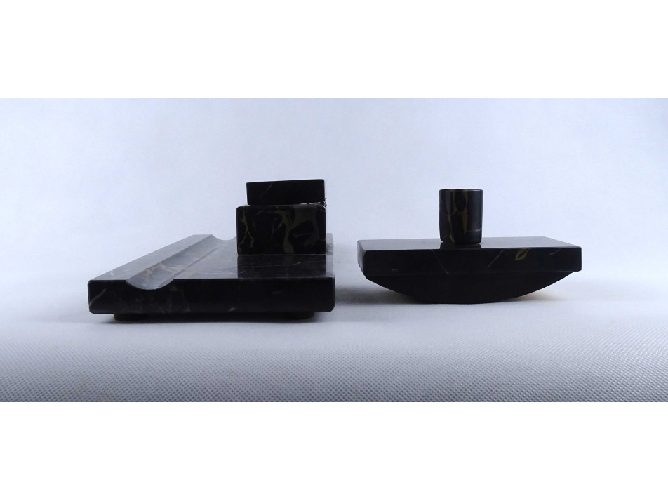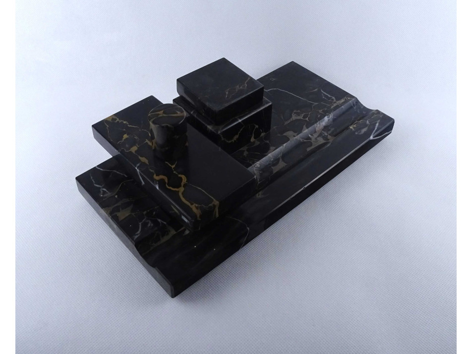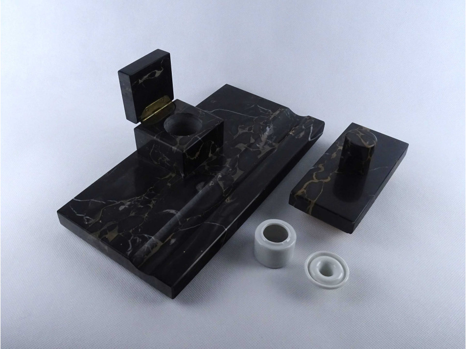 Régi nagyméretű, téglalap alakú, sötétszürke színű, márvány íróasztali készlet, tintatartó, kalamáris és tapper. Rajta egyállásos fedeles tintatartó hiánytalan ép porcelán betéttel.