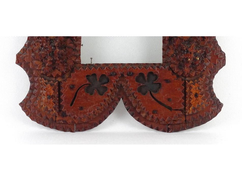 Régi, szép állapotú, gazdagon faragott fényképkeret, üveglappal. Akasztási lehetőséggel rendelkezik. Rajta négylevelű lóhere díszítés.