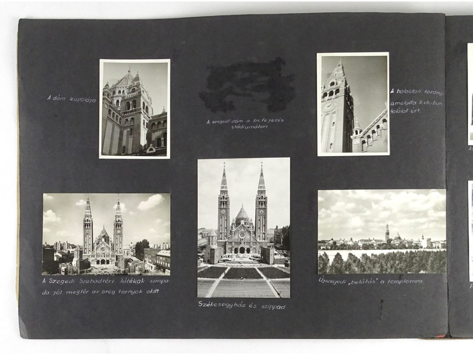 Egyedi készítésű fotó és képeslap album. 10 lapos albumban, 8 lapon és 16 oldalon a Fogadalmi Templom, az altemplom és Dóm tér építészetét mutatja be.