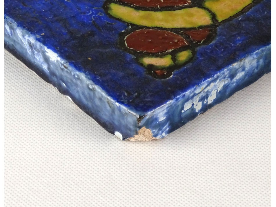 Iparművészeti alkotás, falra akasztási lehetőséggel rendelkezik. Csorgatott mázas, modern samott falidísz.