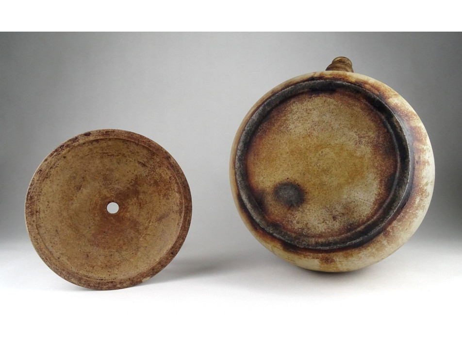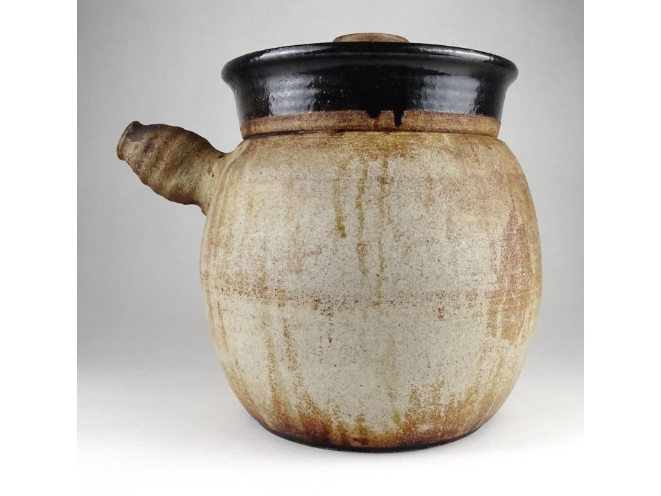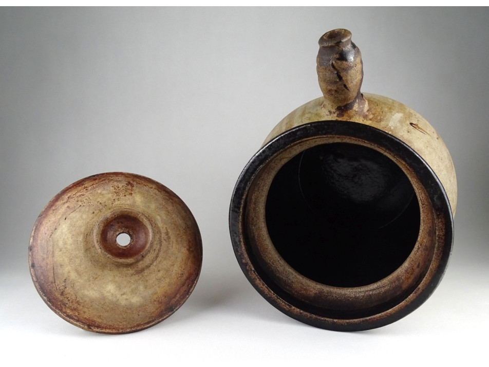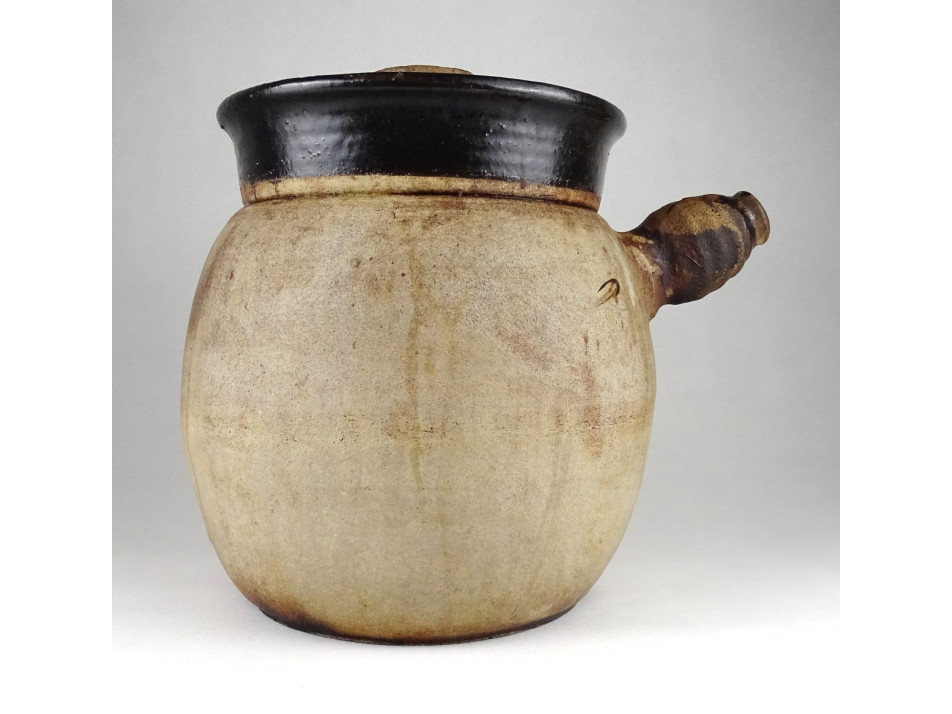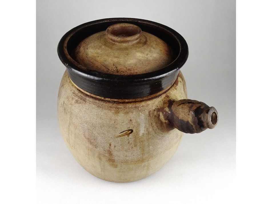 Antik, nagy méretű, hibátlan állapotú kívül vászon, belül barna mázas cserépedény, cserép fazék lyukas tetejű fedővel. Üreges füllel rendelkezik. Ritka, különleges forma. Gyűjtői darab!