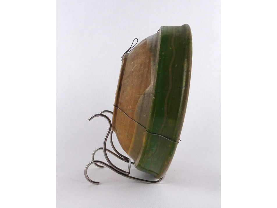 Antik, szép állapotú zöld mázas cseréptál, falra akasztási lehetőséggel. A tálon repedés látható.