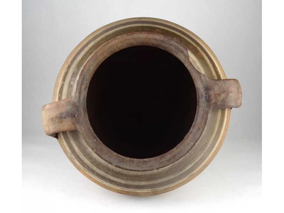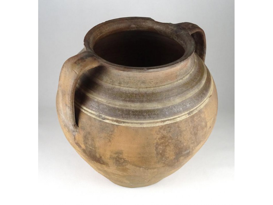 Régi nagy méretű, kétfülű, széles szájú, nagy hasas gömöri cserép. Nyakánál mázas. Alja törött, ragasztott és a száján egy kitörés található, lásd fotó.