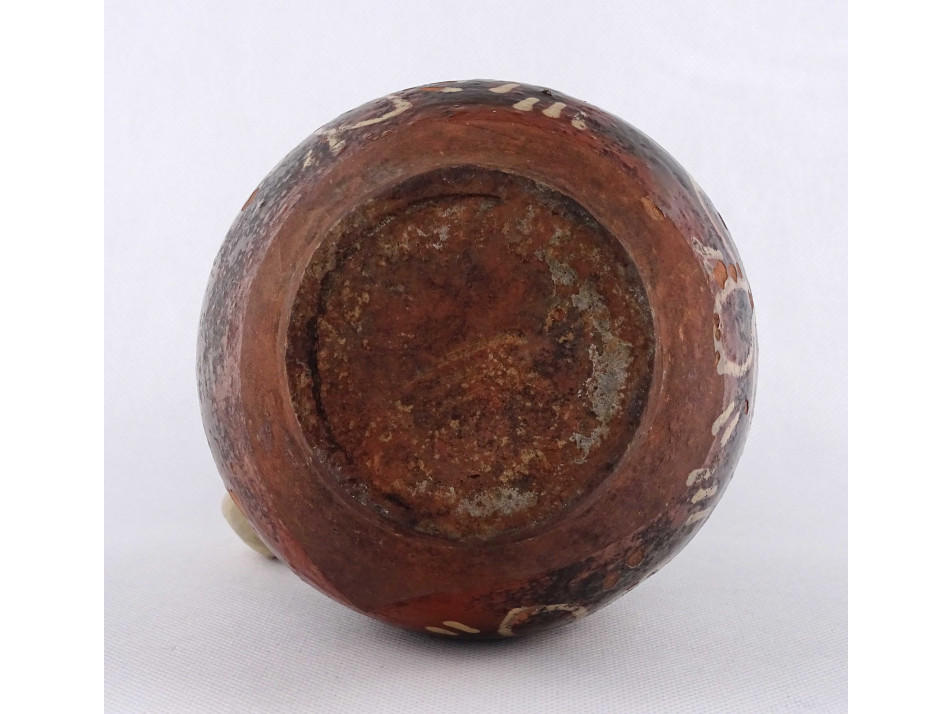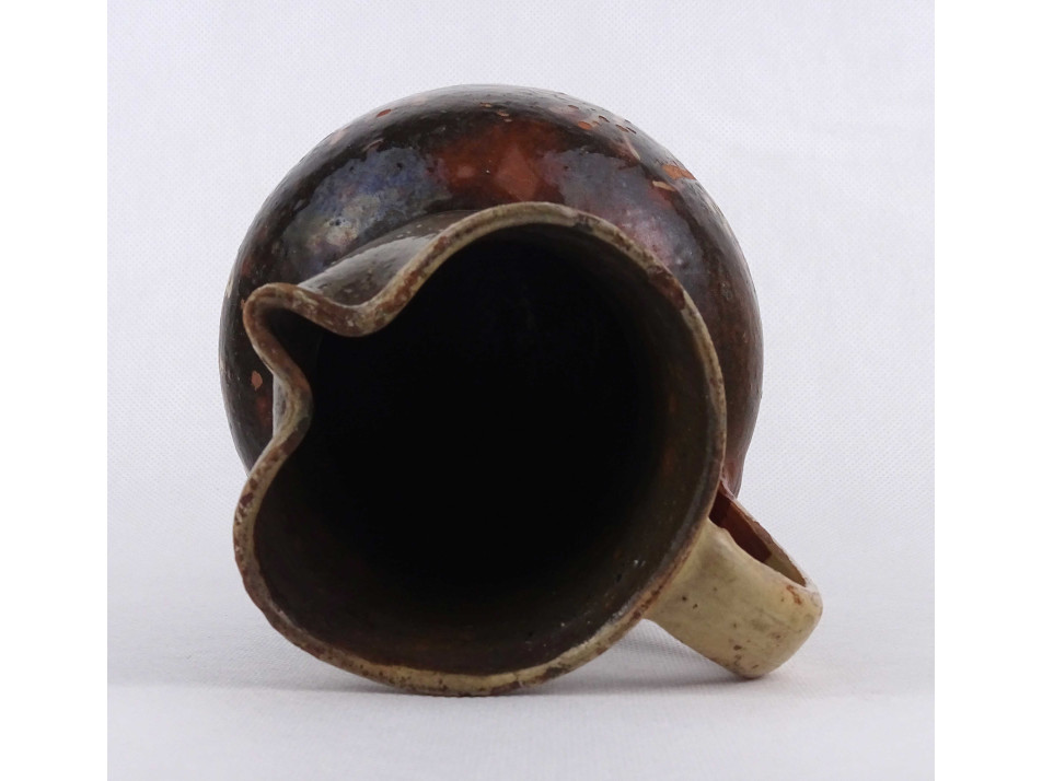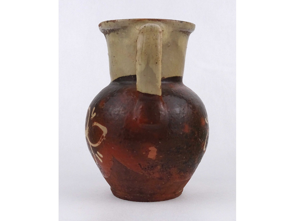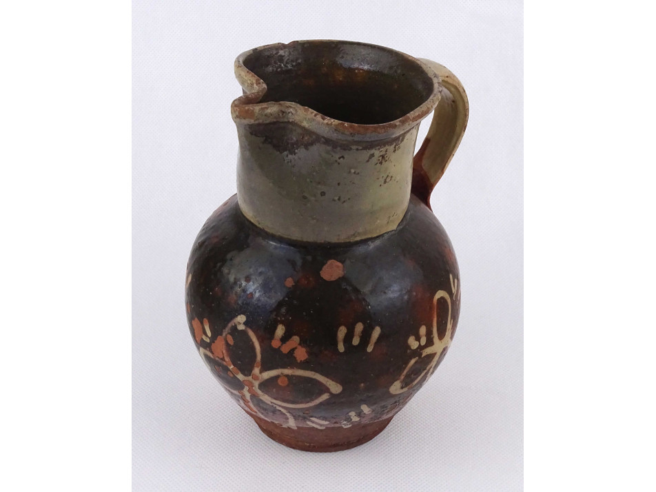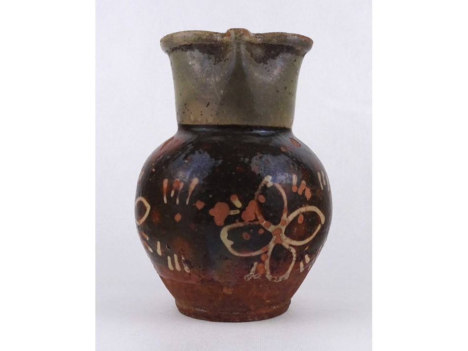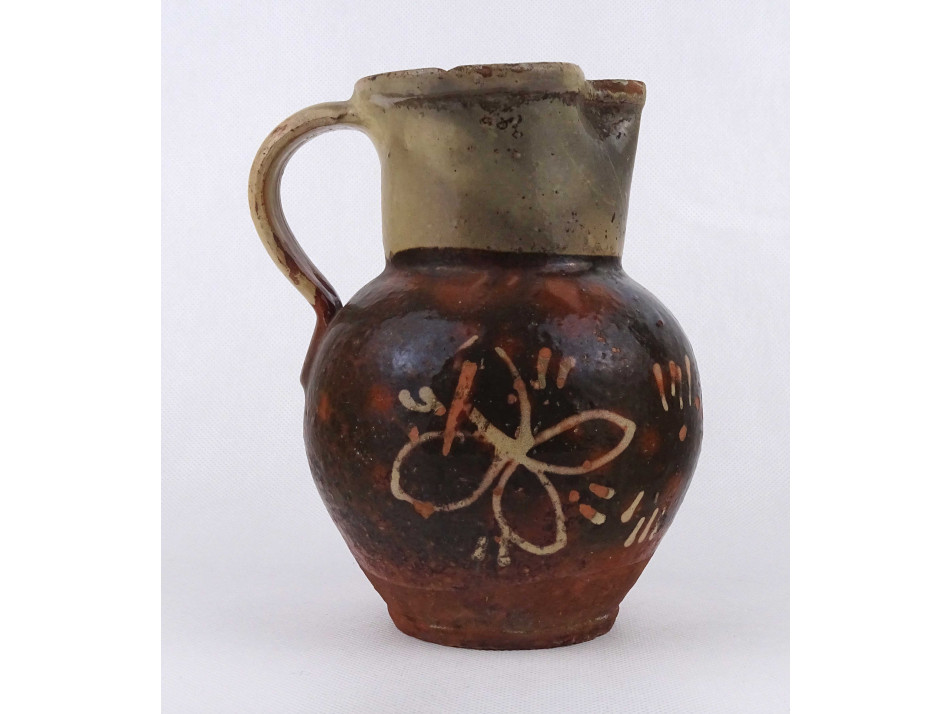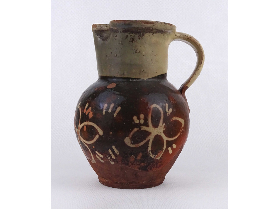 Antik, szép állapotú, egyfülű, szürke - barna mázas, virágmintás népi cserép korsó, asztali korsó. A felső peremén néhány apró sérülés található.