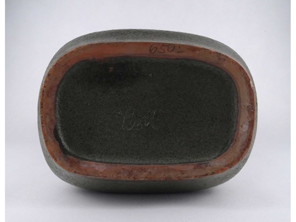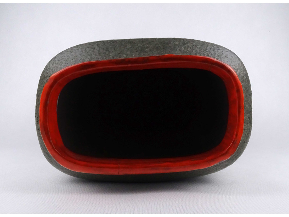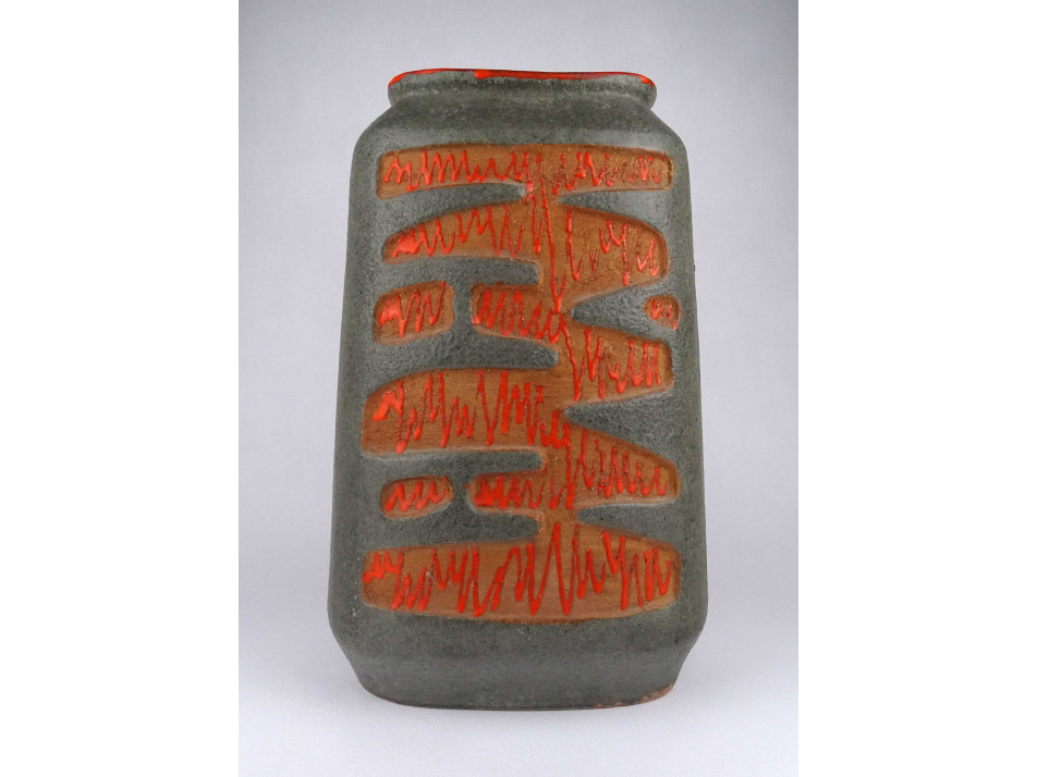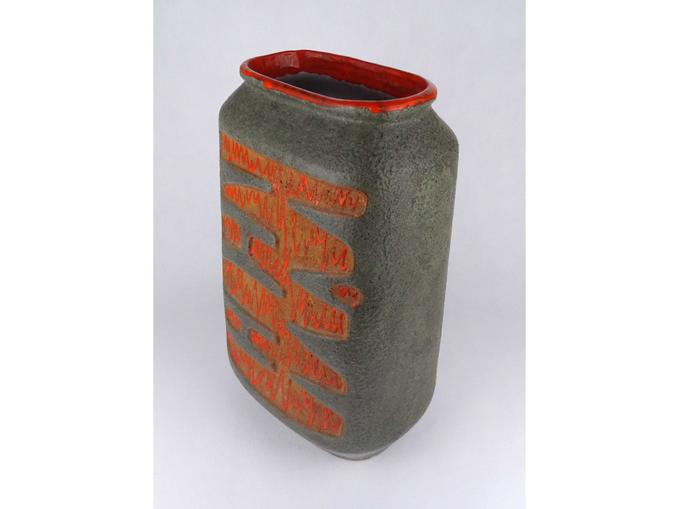 Hibátlan állapotú, nagyméretű, iparművészeti, zöld mázas, kerámia váza, padlóváza élénk narancssárga nonfiguratív díszítésekkel.