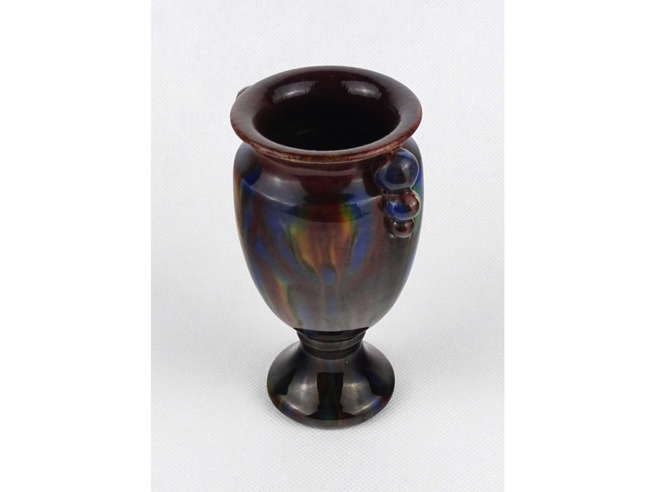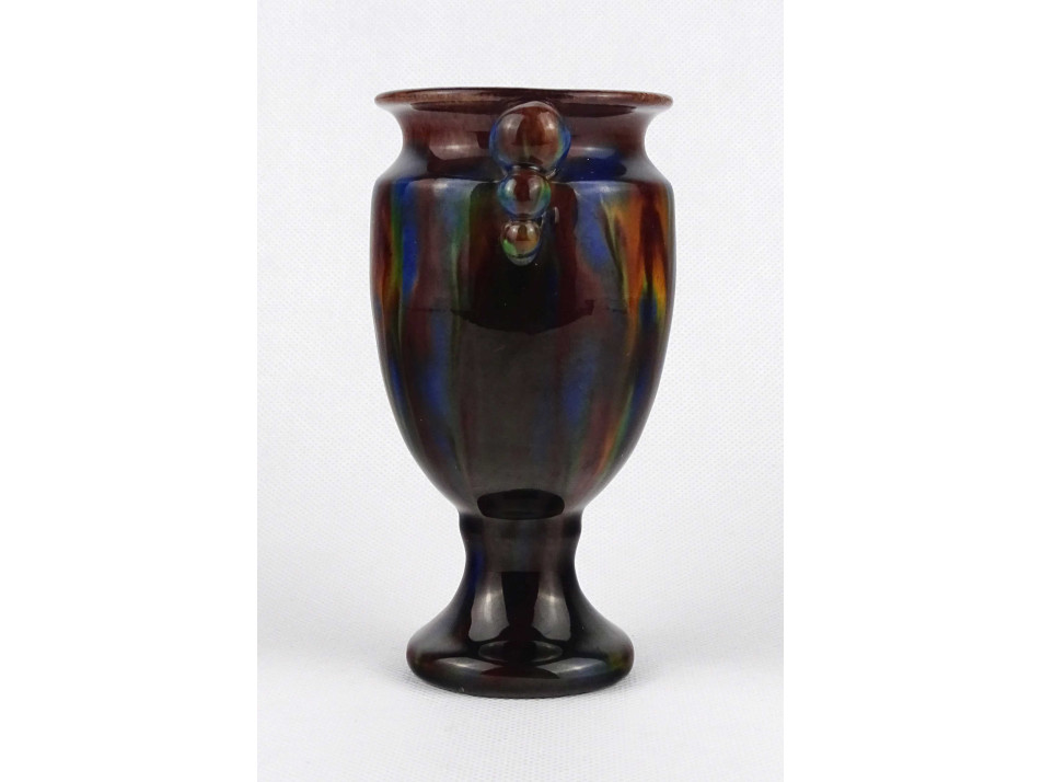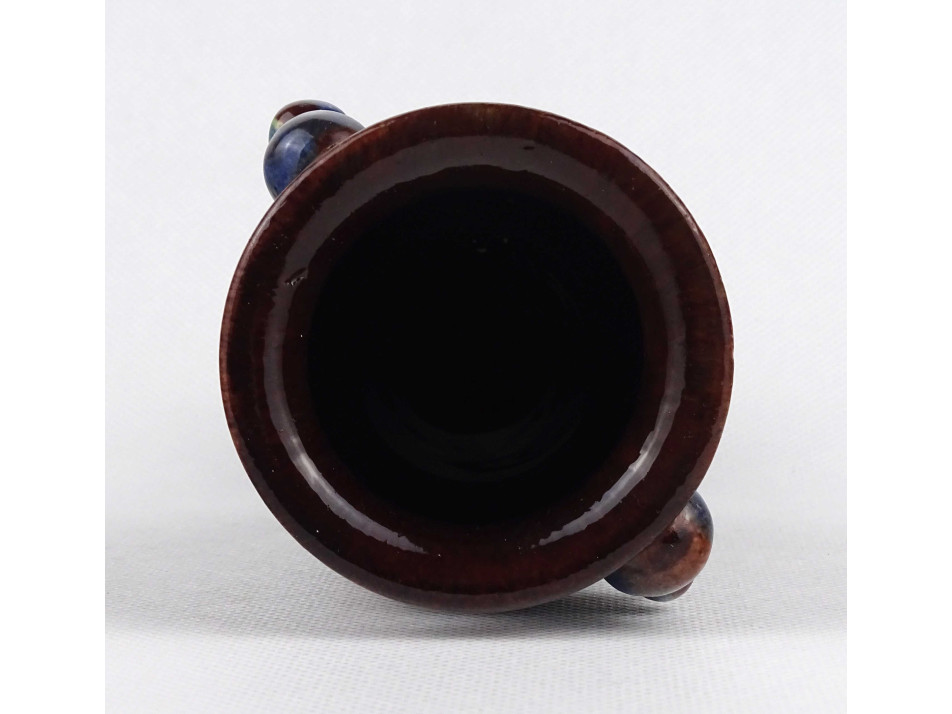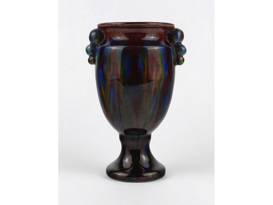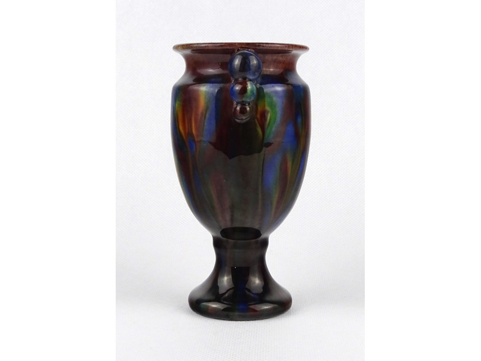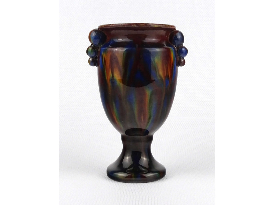 Régi, jelzetlen, színes mázas mezőtúri Badár kerámia talpas váza. A váza felső pereme restaurátor által szakszerűen javított.