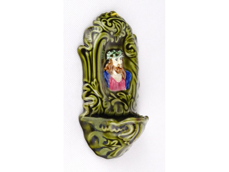 Régi, szép állapotú, zöld színű mázas kerámia szenteltvíztartó. Rajta kézzel festett Jézus portré. Falra akasztási lehetőséggel rendelkezik. A szenteltvíztartón régebbi restaurálás nyoma található.