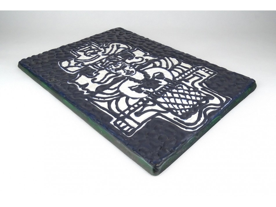 Nagy méretű, akasztási lehetőséggel rendelkező ritka falikerámia. Rajta azték minta, díszítés.
