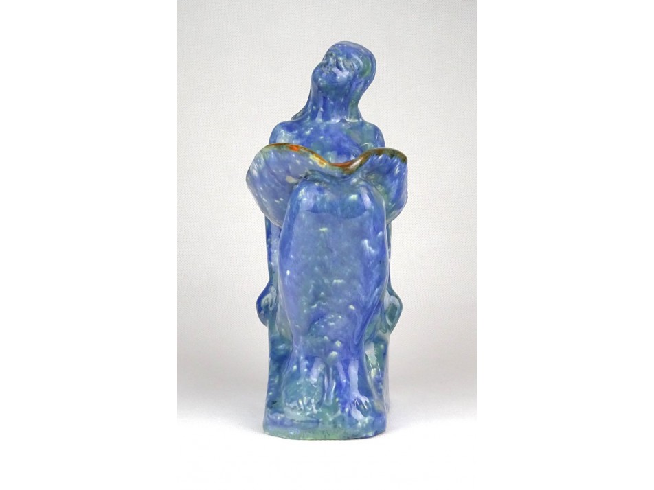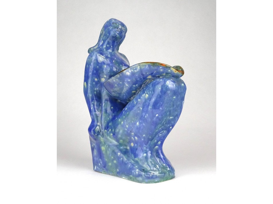 Szép állapotú, művészi, folyatott, csorgatott kék mázas art deco kerámia ülő akt figura, az ~1920-30-as évekből.