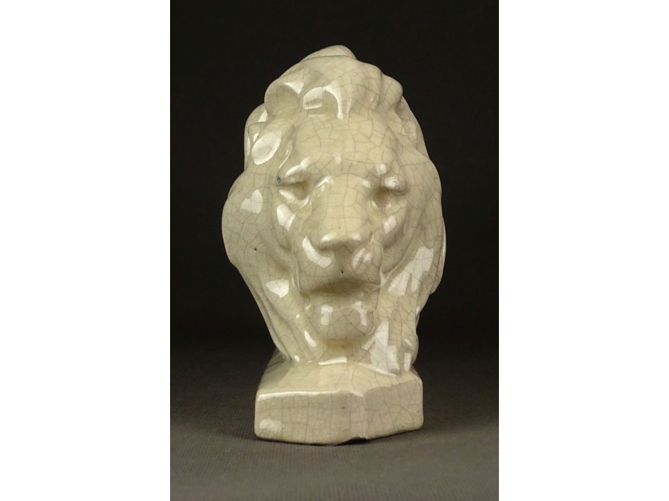Régi, hibátlan állapotú, vajszínű repesztett mázas kerámia oroszlán szobor talapzaton.