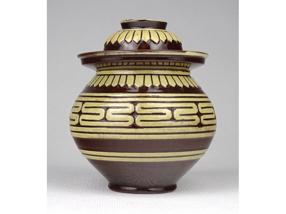 Régi kisméretű tradicionális kínai fedeles cserép edény 10.5 cm