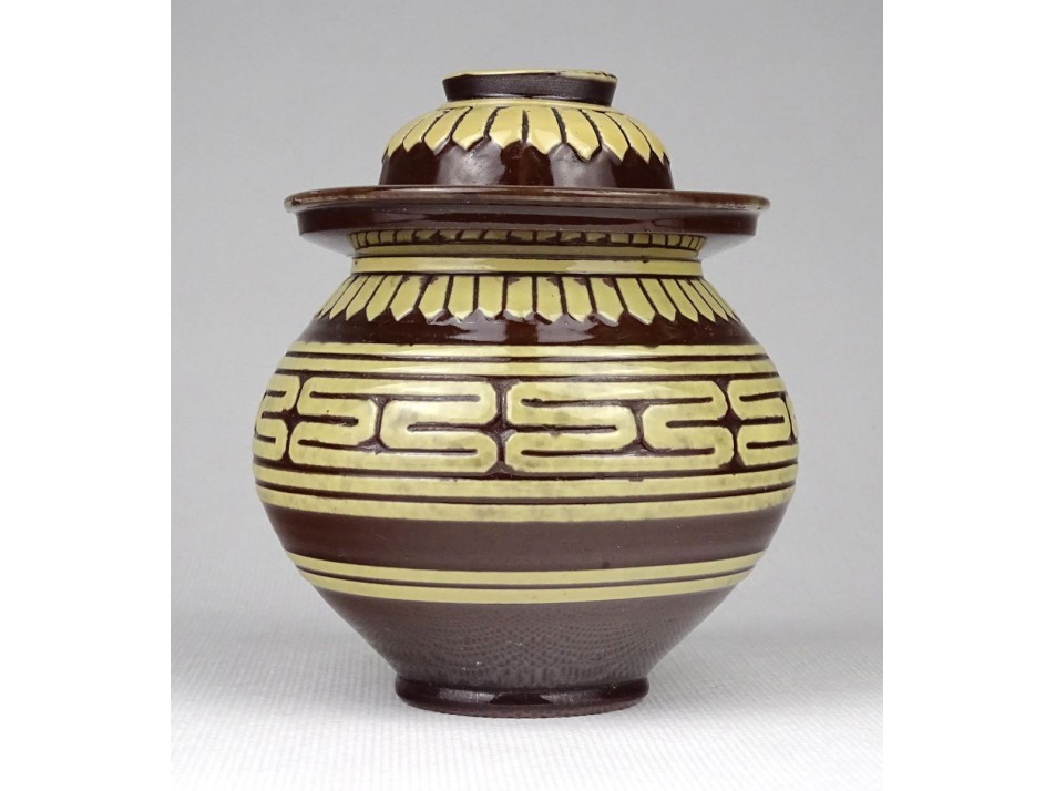 Hibátlan állapotú, kívül mázas, belül vászon cserép edény. Felülete barna mázon vajszínű kézi festéssel díszített.