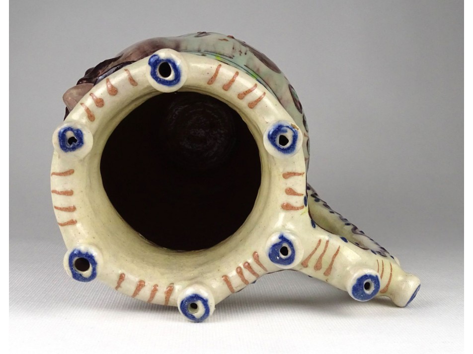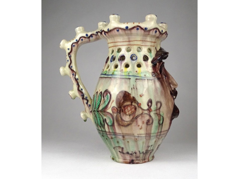 Szép állapotú, áttört motívumokkal díszített, mázas kerámia füles korsó, csalikancsó. Oldalát nagy méretű plasztikus bajszos férfi arc díszíti.