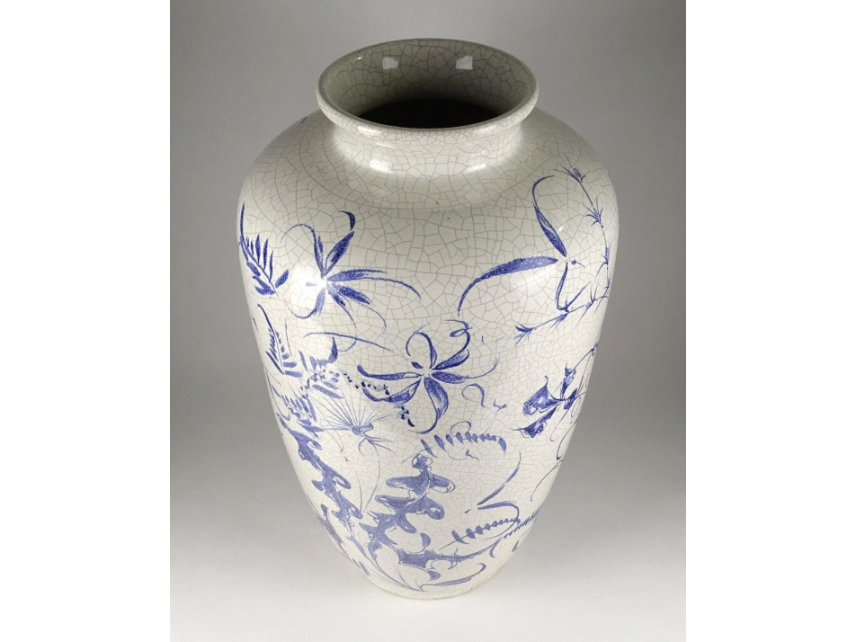 Nagy méretű, vastagfalú kerámia váza, padlóváza, díszváza az 1950-es évekből. Német kerámia műhely "Craquelle" mázas, repesztett mázas kék kézi festésű darabja.