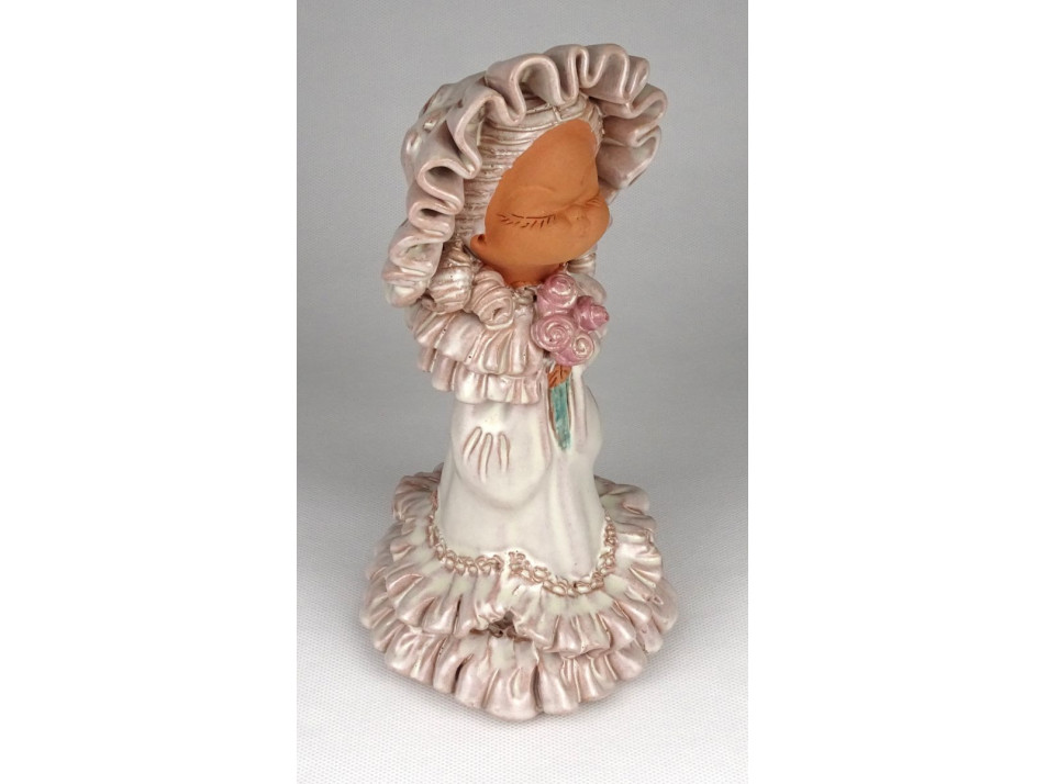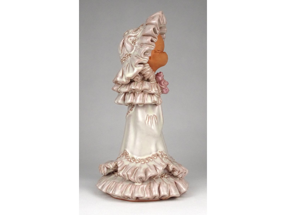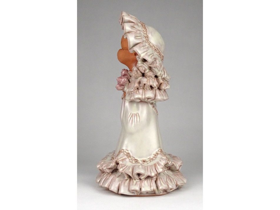Hibátlan állapotú, jelzett fodros ruhás, lehunyt szemű kisasszony, kezében virágcsokor.