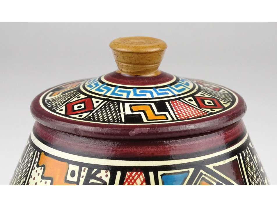 Szép állapotú, kis méretű, kézzel festett perui fedeles kerámia bonbonier. Oldalán láma díszítés.