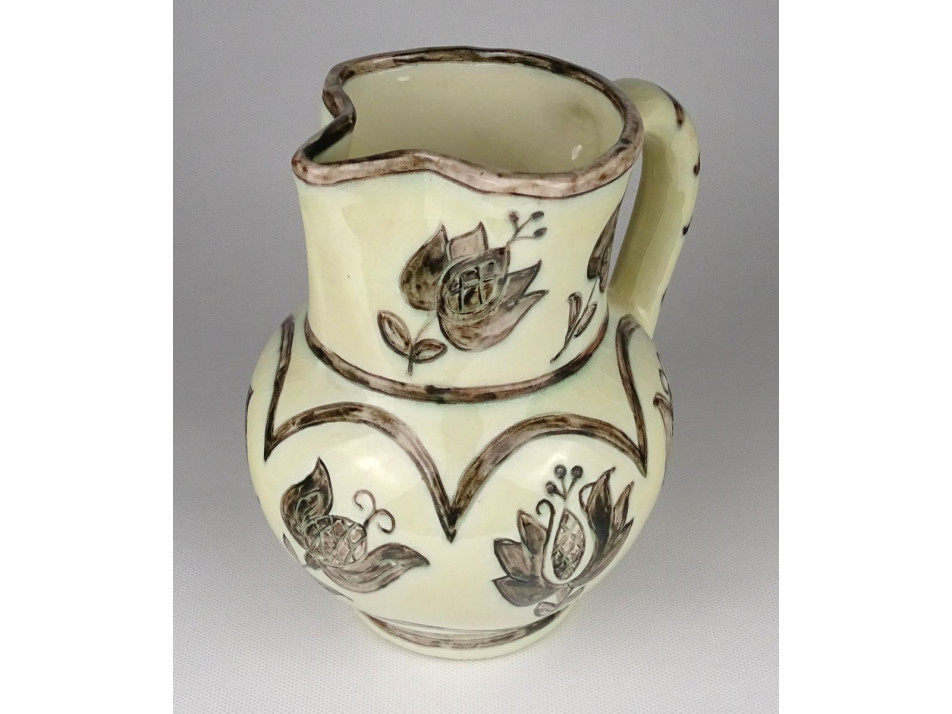 Jelzett, hibátlan állapotú, vajszínű mázas kerámia kancsó. Kézi festéssel díszített, klasszikus Zsolnay forma.