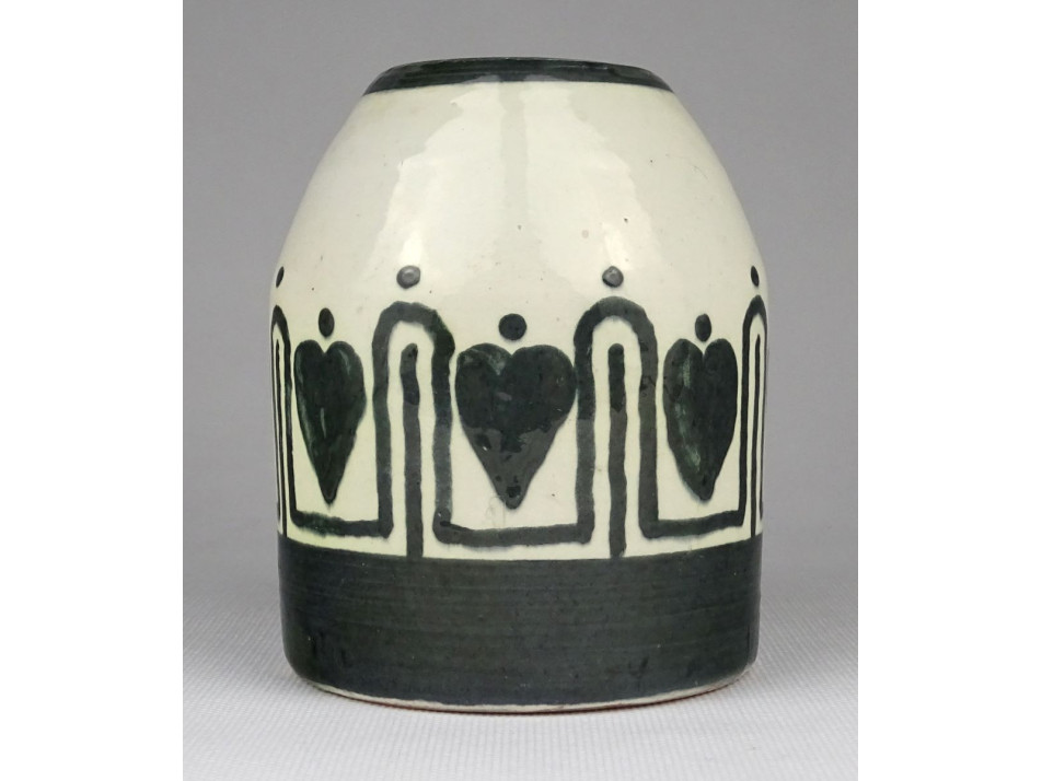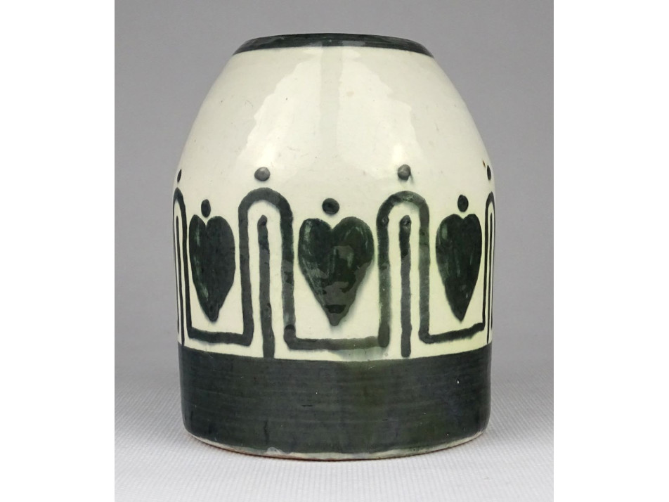 Antik, hibátlan állapotú jelzett mázas kerámia váza. Oldalán kézzel festett szív motívumos máz alatti népi szecessziós díszítés.