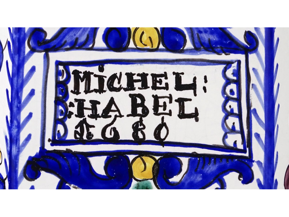 Hibátlan állapotú, gyönyörű habán motívumokkal díszített, népi motívumos, mázas kerámia. Hatszögletű kerámia, oldalán két templom ábrázolás gazdag habán motívumokkal. Kézzel festett nagyméretű kerámia.