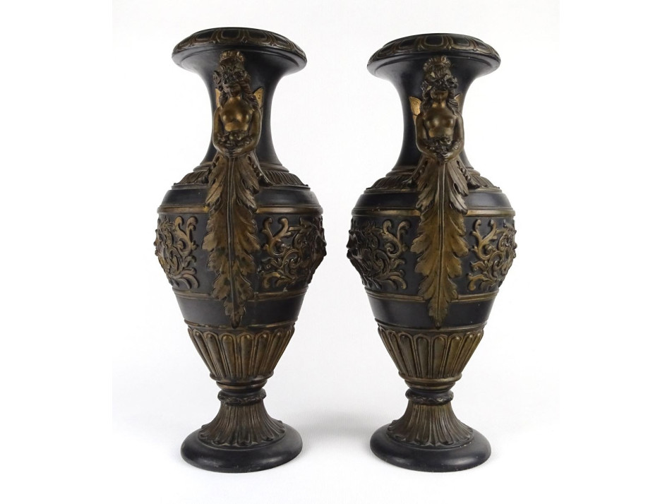 Antik nagy méretű szép állapotú jelzett terrakotta váza pár. Sötét alapmázon kézzel festett aranyozott plasztikus faunfej, levél, és női alak díszítésekkel.