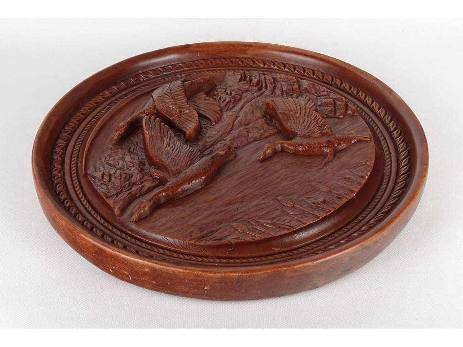 Szép állapotú, akasztási lehetőséggel rendelkező nagy méretű kerámia fali tál, fali dísz tál. Rajta három plasztikus vadlúd látható.