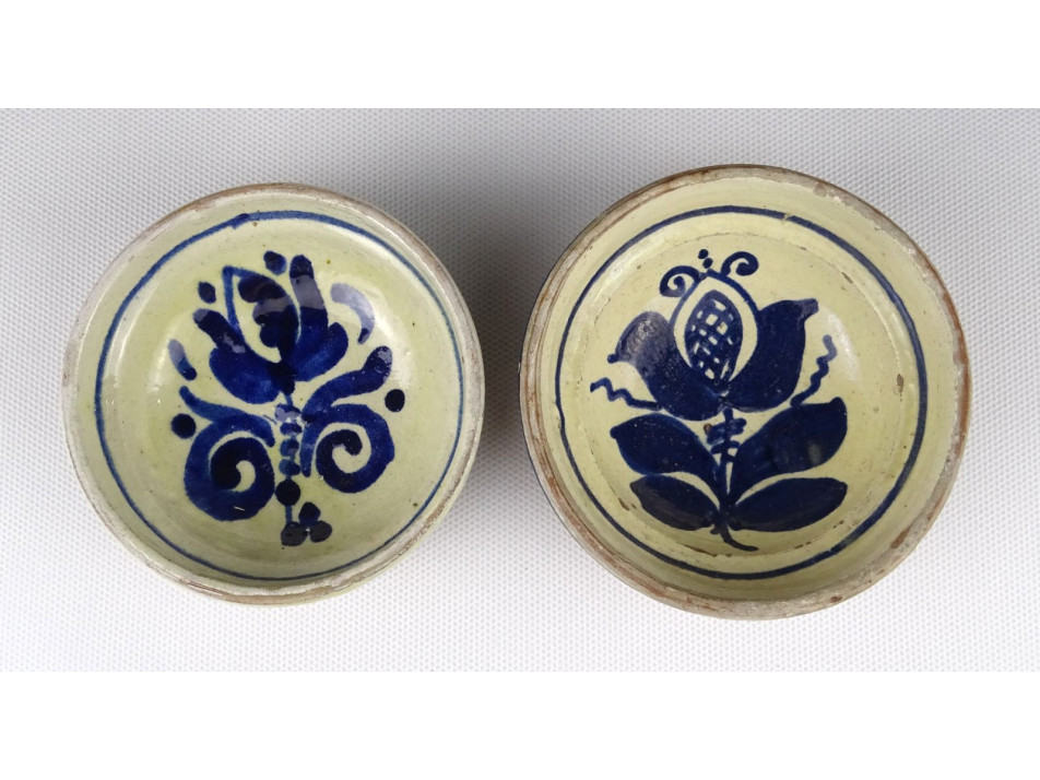 Régi szép állapotú, kék - fehér mintás kis méretű cserép tál, párban. Akasztási lehetőséggel rendelkeznek.