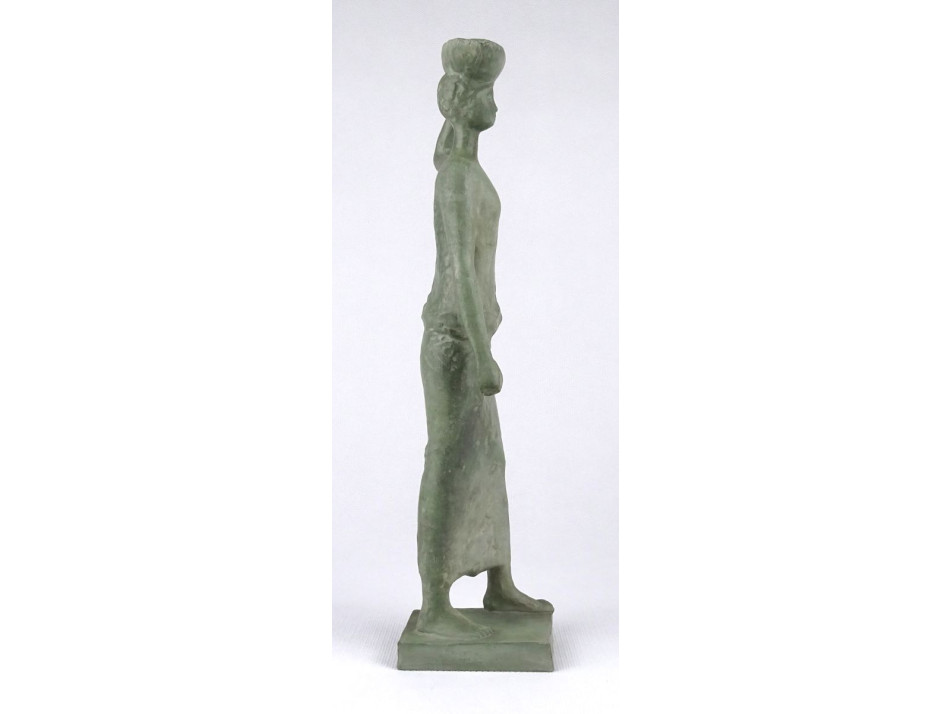 Hibátlan állapotú jelzett, talapzaton álló zöld kerámia szobor. Mezítlábas nő, fején tállal.