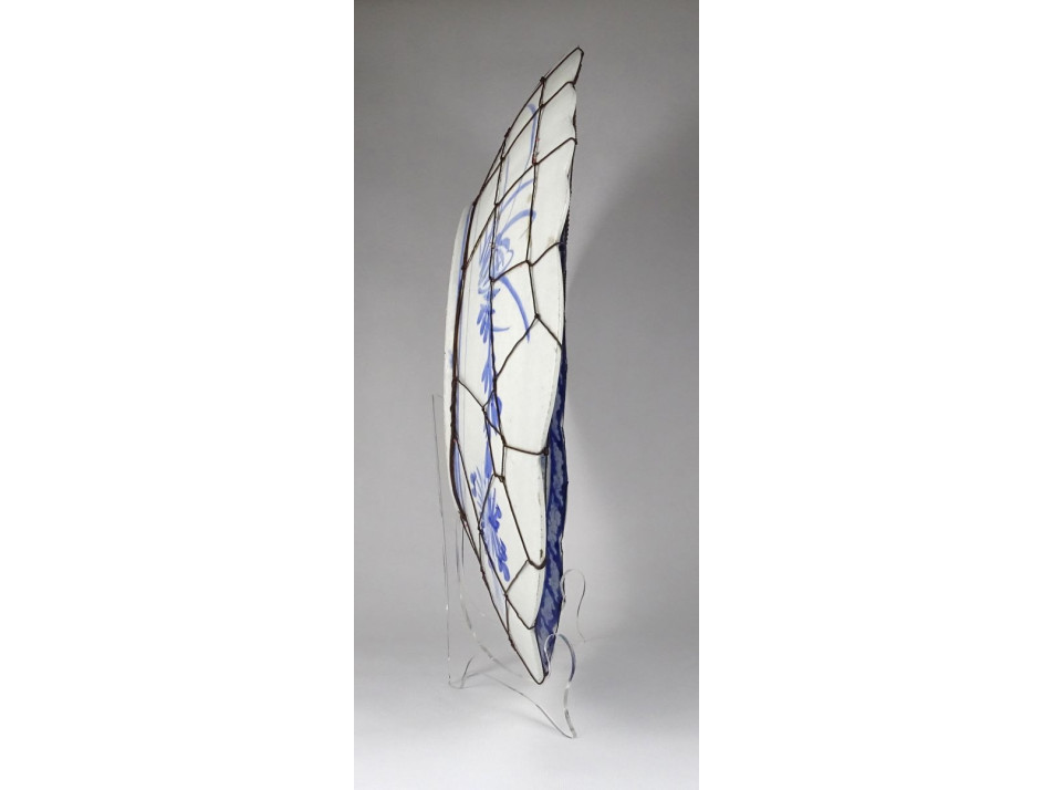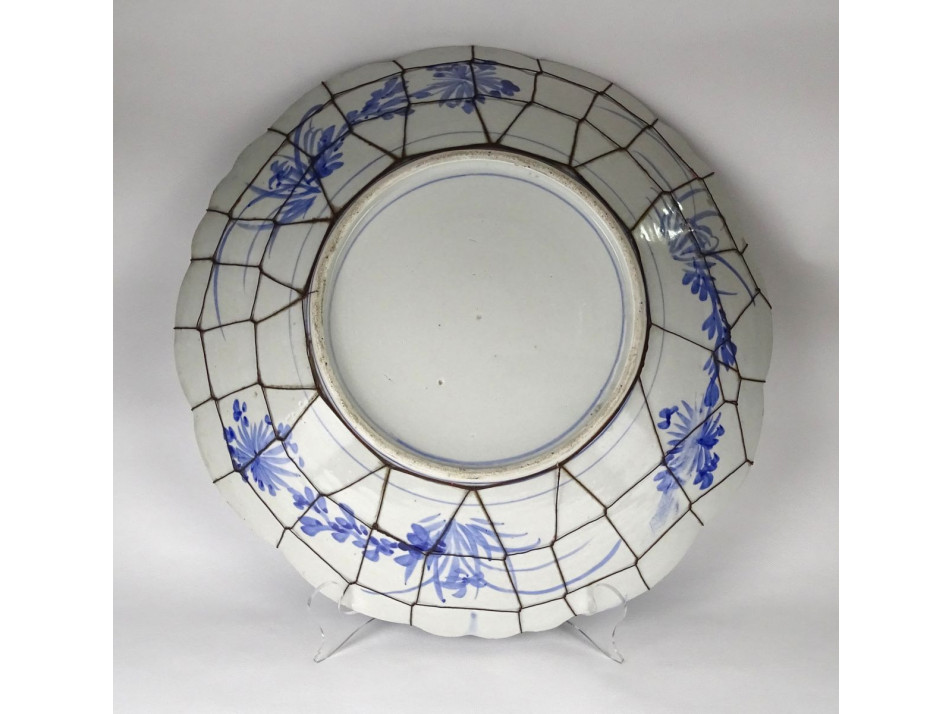 Antik, nagyméretű, kékkel festett, krizanténnal gazdagon díszített, főnixmadaras, kézzel festett kőcserép tál. Körben az akaszthatóság céljából drótozott, nem törött, nem repedt.